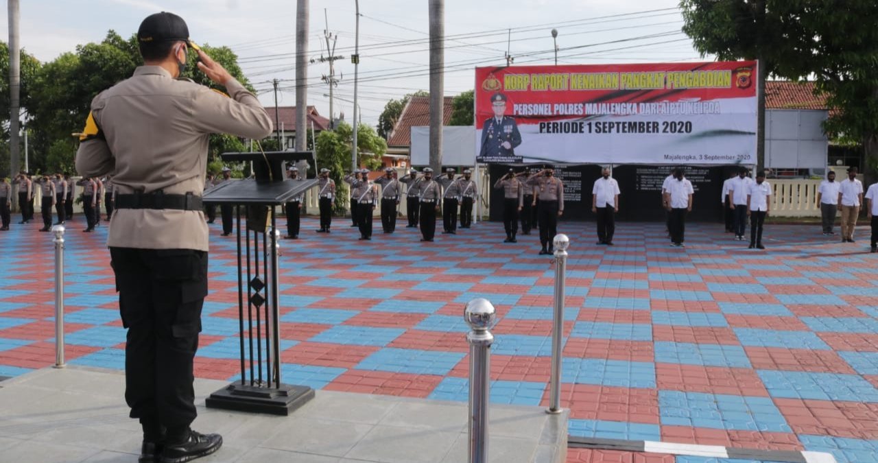Majalengka, Sriwijaya Media-Kepala Kepolisian Resor (Kapolres) Majalengka AKBP Dr Bismo Teguh Prakoso memimpin upacara korps raport kenaikan pangkat pengabdian personel Polres Majakengka TMT 01 September 2020, dengan tetap menerapkan protokol kesehatan (prokes) Covid 19, di lapangan apel Polres Majalengka, Kamis (3/9/2020).