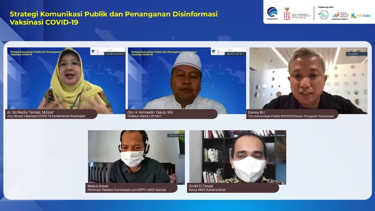 Sumbar, Sriwijaya Media-Kementerian Kominfo dan Komite Penanganan Covid-19 dan Pemulihan Ekonomi Nasional (KPCPEN), SIBERKREASI dan Kitatama, bekerjasama dengan Asosiasi Media Siber Indonesia (AMSI) Sumatera Barat (Sumbar) menggelar sesi pelatihan dan dialog “Strategi Komunikasi Publik dan Penanganan Disinformasi Vaksinasi Covid-19”, pada Jum’at (26/2/2021).