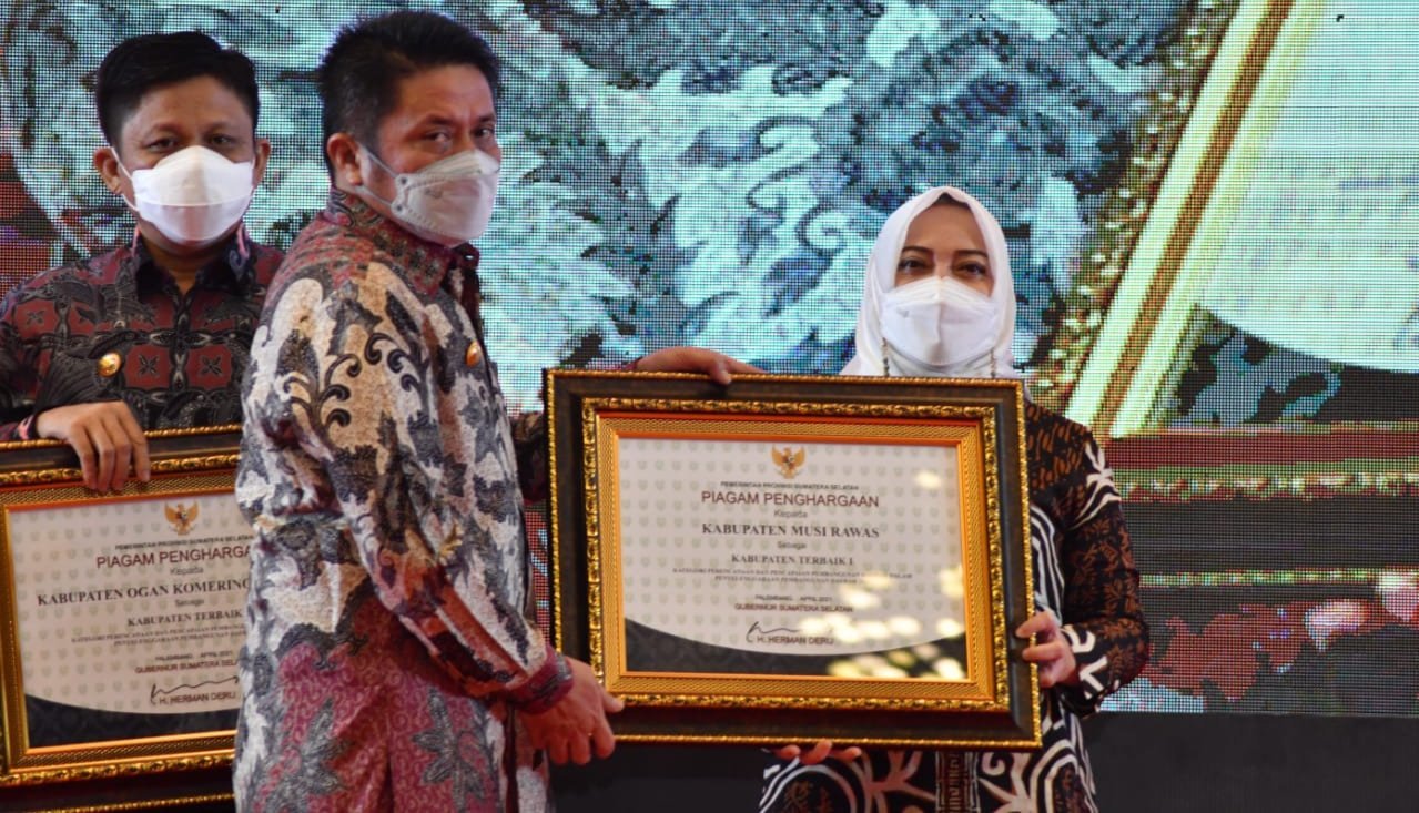 Musi Rawas, Sriwijaya Media – Gubernur Sumsel H Herman Deru secara langsung memberikan penganugerahan Penghargaan Pembangunan Daerah (PPD) kepada Bupati Musi Rawas (Mura) Hj Ratna Machmud sebagai Kabupaten Terbaik I, dalam kategori Perencanaan dan Pencapaian Pembangunan Daerah tahun 2021, di Hotel Santika Premiere Bandara Palembang Palembang, Jum’at (23/04/2021).