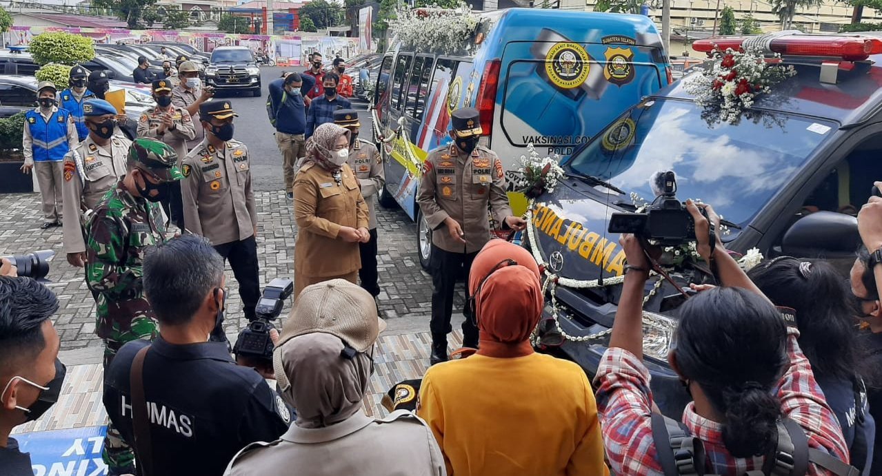 Palembang, Sriwijaya Media-Kapolda Sumsel Irjen Pol Prof Dr Eko Indra Heri S., MM., meresmikan Mobile Vaksinasi Covid-19 Rumah Sakit (RS) Bhayangkara Polda Sumsel sekaligus menyalurkan paket Lebaran, berlangsung di Halaman Gedung Promoter, Senin (26/4/2021).