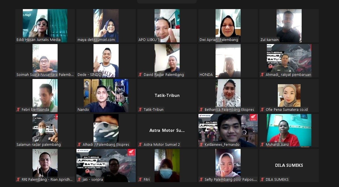 Palembang, Sriwijaya Media – Untuk menjalin silaturahmi dan keakraban, management Astra Motor Honda Sumatera Selatan (Sumsel) melaksanakan Gathering bersama “Jurnalis Satu Hati” yang dilaksanakan melalui aplikasi zoom meeting, Sabtu (28/8/2021).