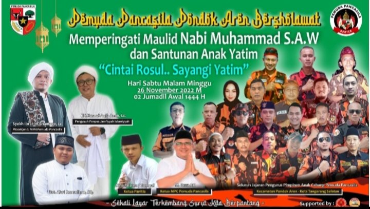 Sriwijayamedia.com – Pimpinan Anak Cabang (PAC) Pemuda Pancasila (PP) Pondok Aren menyelenggarakan kegiatan “Pemuda Pancasila Pondok Aren Bersholawat”, memperingati Maulid Nabi Muhammad SAW dan santunan anak yatim dengan mengambil tema “Cintai Rosul, Sayangi Yatim”, di Lapangan Bulu Tangkis Pondok Pucung, Sabtu (26/11/2022).