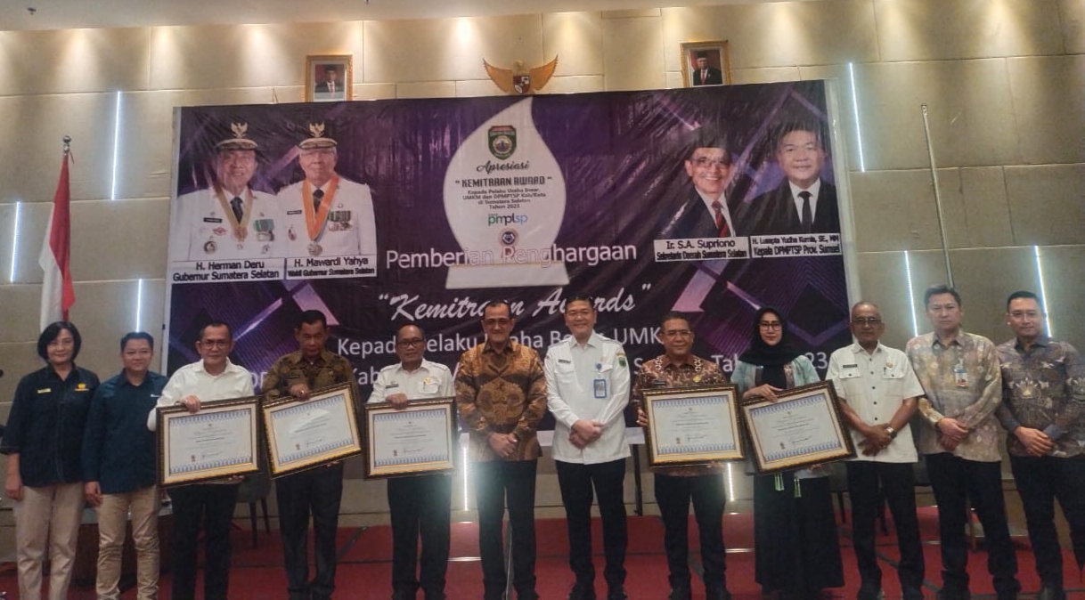 Sriwijayamedia.com – Dinas Penanaman Modal Pelayanan Terpadu Satu Pintu (DPMPTSP) Sumsel memberikan apresiasi berupa “Kemitraan Award” kepada pelaku usaha besar, usaha mikro kecil menengah (UMKM), dan DPMPTSP kabupaten/kota di Sumsel, berlangsung di Ballroom The Alts Hotel Palembang, Rabu (30/8/2023).