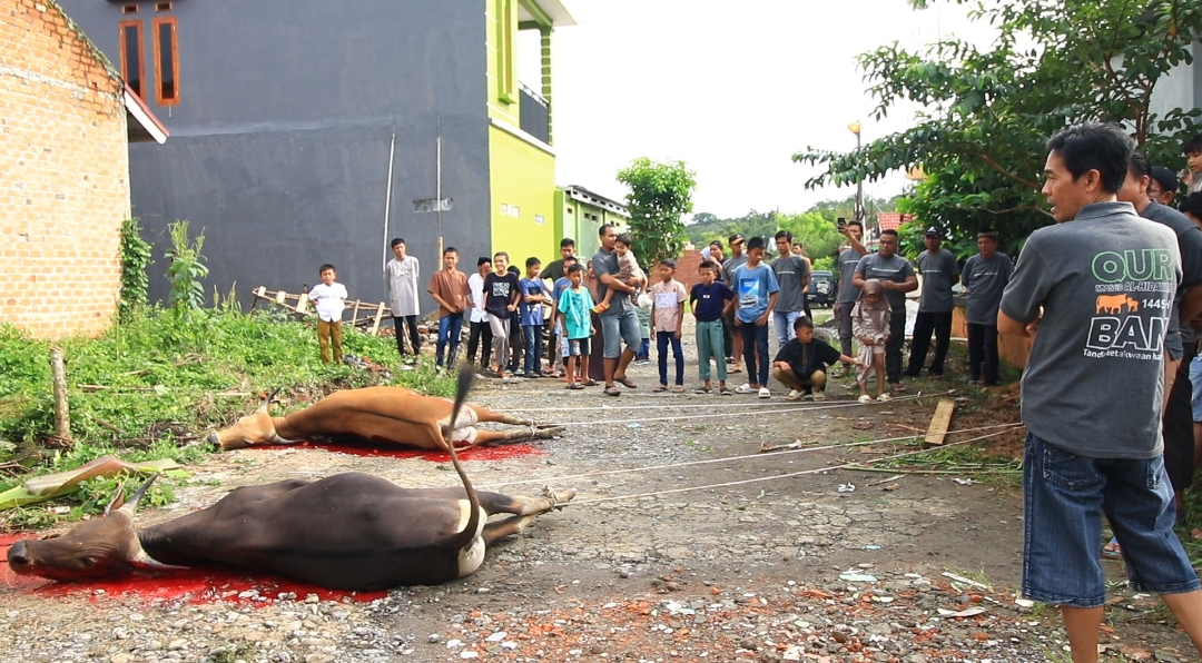Perumahan Green Garden Residence Manggul menyembelih hewan kurban sebanyak 7 ekor sapi 5 ekor kambing di Hari Raya Idul Adha 1445 Hijriah, di halaman masjid setempat, Senin (17/6/2024)/sriwijayamedia.com-sisil