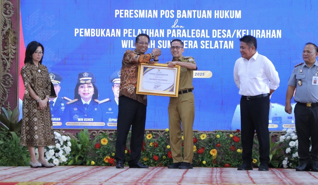 Sriwijayamedia.com- Program Wali Kota (Wako) dan Wakil Wali Kota (Wawako) Palembang Ratu Dewa – Prima Salam (RDPS) Palembang Peduli, dengan memberikan bantuan hukum gratis yang ditempatkan setiap kelurahan di 18 kecamatan diganjar penghargaan Kementerian Hukum (Kemnkum) Republik Indonesia (RI), Senin (28/7/2025), di Griya Agung Palembang.