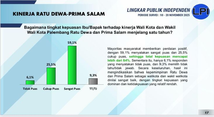 Berdasar hasil survei terbaru yang dilakukan oleh Lingkar Publik Independen (LPI) sebanyak 95 persen warga Palembang diklaim puas terhadap kinerja pasangan kepala daerah tersebut.