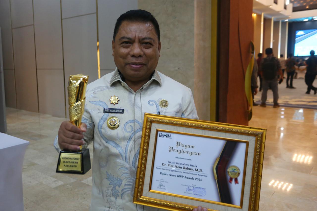 Bupati Halmahera Utara Piet Hein Babua, meraih penghargaan dalam ajang KWP Award 2026 pada kategori Kepala Daerah Tanggap Bencana dan Perlindungan Masyarakat/sriwijayamedia.com-adjie