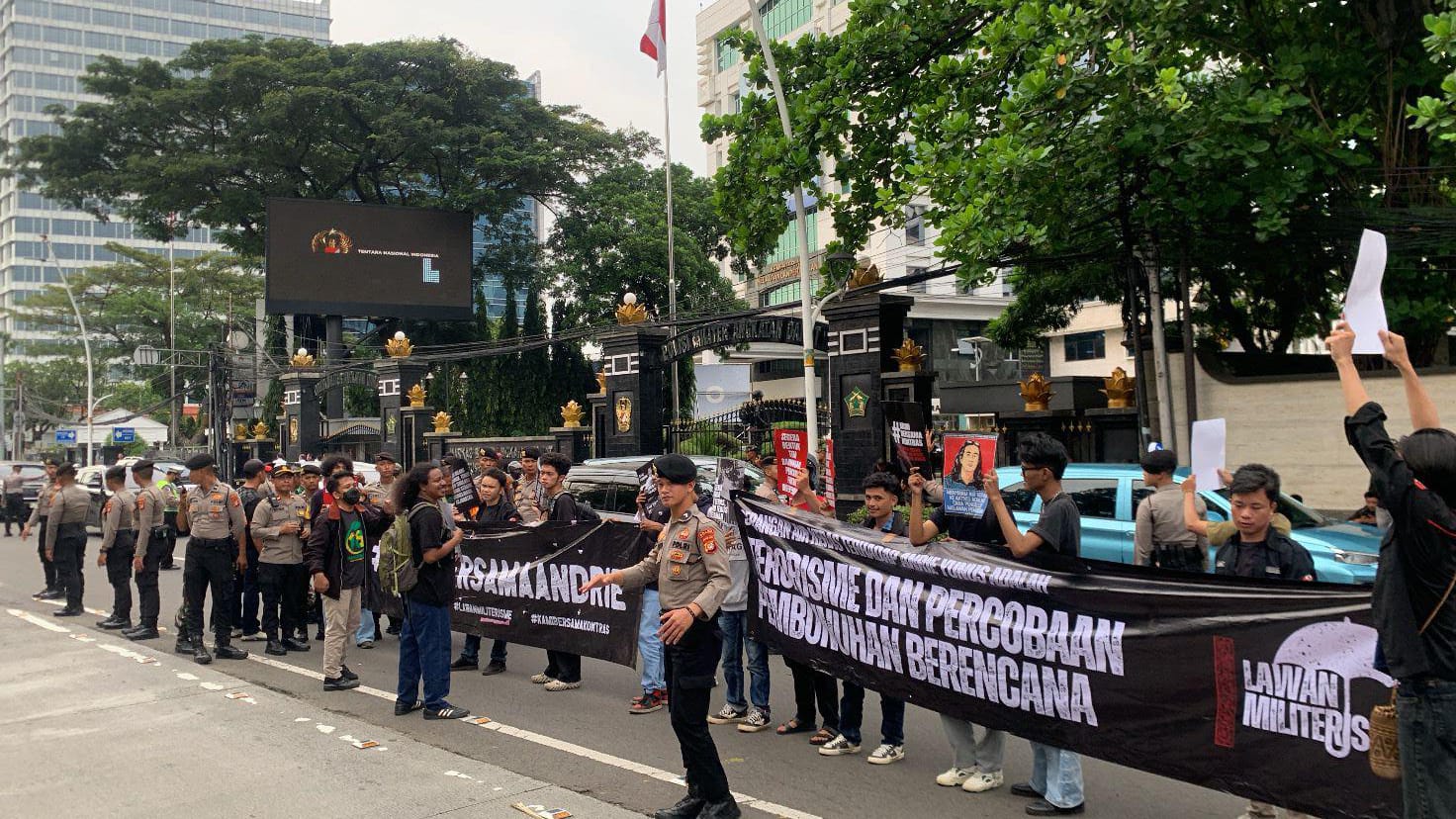 Bahkan massa yang ingin membentangkan banner yang berisi “Usut Tuntas Aktor Intelektual dan Rantai Komando dalam Kasus Andrie Yunus” pun tidak diperbolehkan dan bahkan didorong dengan keras sampai memasuki jalan umum sehingga mengakibatkan kemacetan panjang.