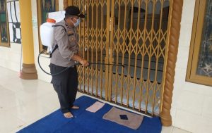 Jelang Salat Idul Adha, Polsek Gunung Meriah Lakukan Penyemprotan Disinfektan